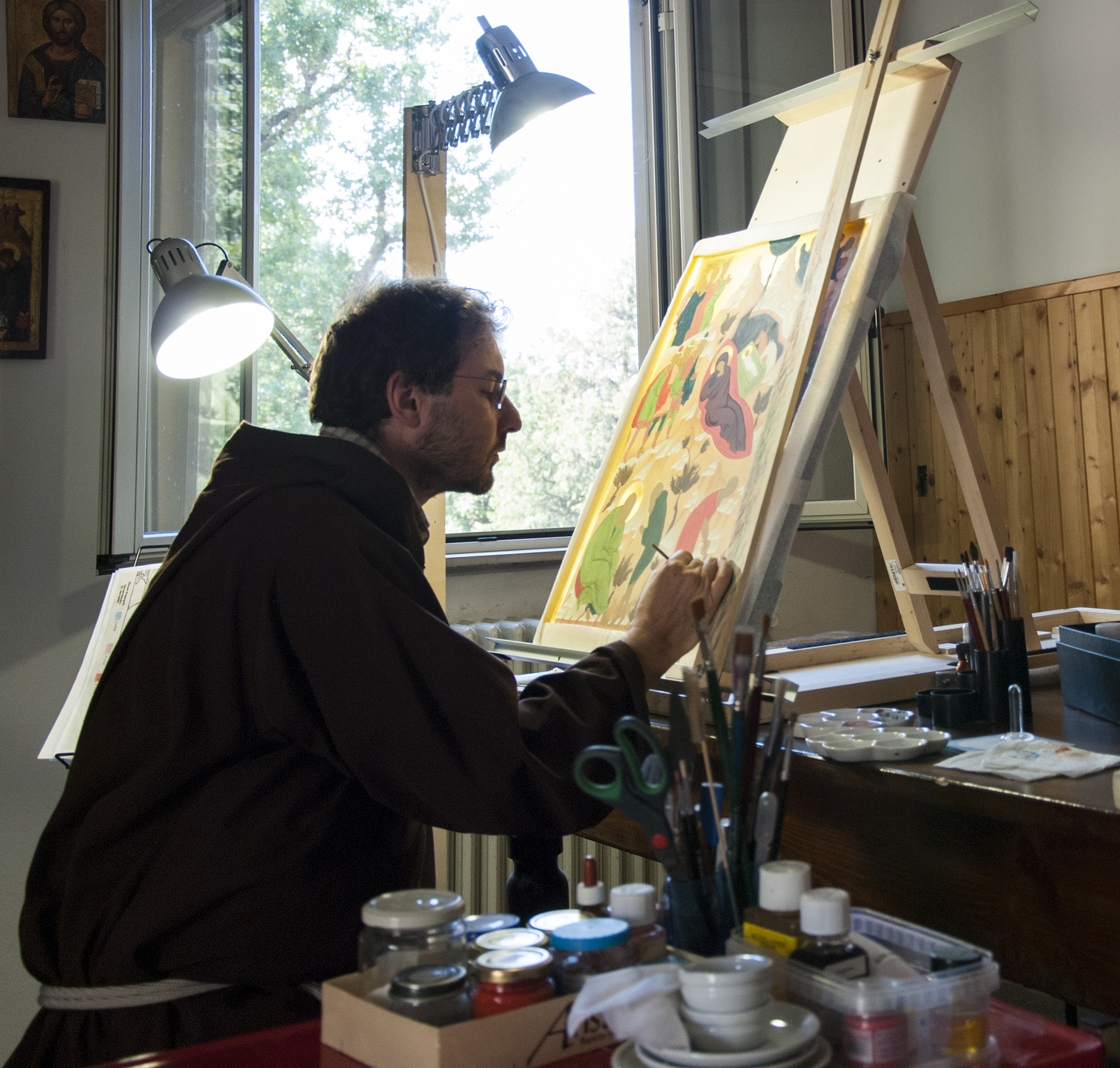 Motivazione: Ora et labora, il lavoro diviene contemplazione. Cuore, mente, mani, colori, spirito, offerta santa che sale come incenso verso Dio. Estremi di luce e neri per esaltare la tavolozza. Quasi un colore selettivo naturale.